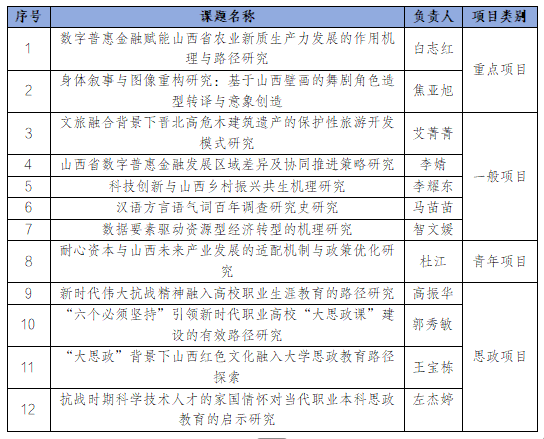 近日,山西省哲学社会科学规划办公室发布了“2025年度山西省哲学社会科学规划课题立项名单”,我校12名教师获批立项,立项课题涵盖了重点、一般、青年、思政4大类别,获批经费14万元,立项类别与数量再创新高。